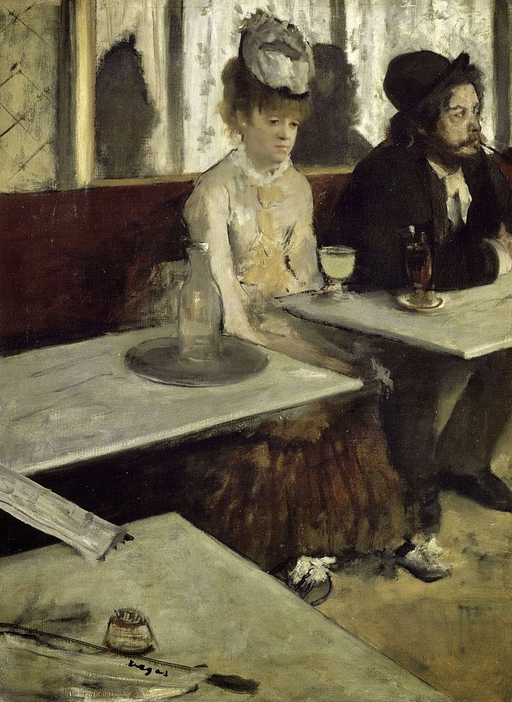 Edgar Degas, In a café or L’Absinthe, 92 × 68.5 cm, oil on canvas, 1873, at Musée d'Orsay, Paris